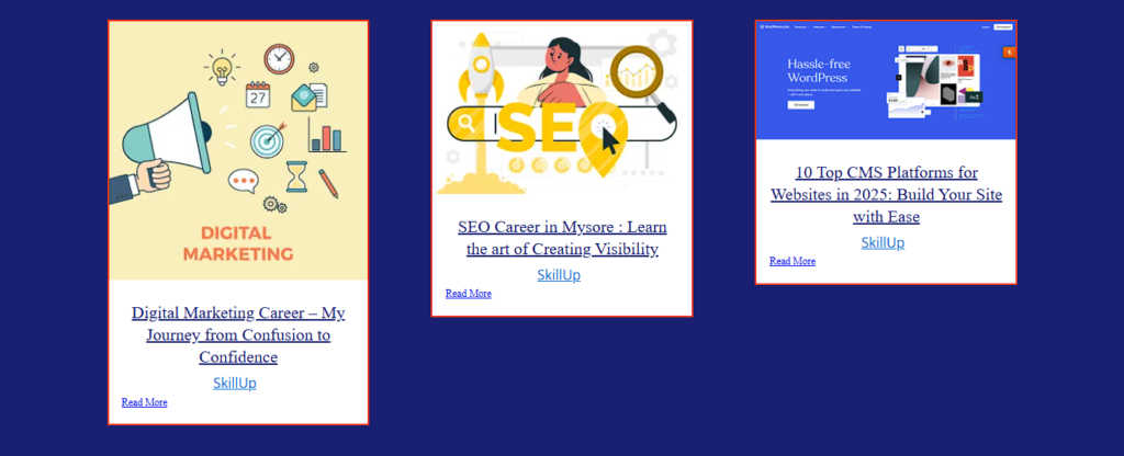 EXCELLENT Based on 125 reviews Posted on Koushi々 KTrustindex verifies that the original source of the review is Google. “Everything was easy to understand, the trainers were really supportive, and the learning was practical. Honestly, this course was worth it.”Posted on Mahesha MaheshTrustindex verifies that the original source of the review is Google. BEST PLACE FOR PLACEMENT AND LEARING NEW SKILLPosted on Laxman k.cTrustindex verifies that the original source of the review is Google. I leant Digital Marketing Course from SkillUp Academy Mysore. they have a one of the best instructor I met till the date and they are supportive too. Here we also gain more practical knowledge about Digital Marketing . All are very supportive and motivating. Anyone who is interested to learn Digital Marketing can join SkillUp Academy without any doubt, SkillUp Academy is one of the best place to learn Digital Marketing Course in Mysore Thanks to SkillUp Academy Mysore for such a great support...Posted on Cpganagangamma cpganagangammaTrustindex verifies that the original source of the review is Google. I had a great experience with skillup academy. The classess are interactive, doubts are cleared properly,and the guidance provided is very useful for exams.it helped me improve my performance significantlyPosted on Cherry K.NTrustindex verifies that the original source of the review is Google. Skill Up is a good company for learning digital marketing. The trainers explain concepts clearly and give practical knowledge. I learned SEO and social media marketing. Overall, it is helpful for beginnersPosted on Karishma KaverammaTrustindex verifies that the original source of the review is Google. I had a good experience learning Digital Marketing at SkillUp Academy. The trainers explained concepts clearly and provided practical examples. This course helped me understand digital marketing better and build useful skills.Posted on Amrutha CjTrustindex verifies that the original source of the review is Google. Skill Up Academic provides quality education with supportive teachers and a friendly learning environment. Very helpful and effective learning experience.Posted on Vanya GaneshTrustindex verifies that the original source of the review is Google. I have finished my Digital Marketing course at SkillUp Academy. The classes were easy to understand and very useful. The trainers explained everything clearly. I learned many new skills. I am happy with the course and training.Posted on Charu DhanyanTrustindex verifies that the original source of the review is Google. I joined Skillup Academy for Digital Marketing course I attended d 3 days demo class that gave me confidence to join digital marketing course at skill up academy they have complete practical session with industrial knowledge I have also completed My internship which boosted my confidence Thank you skill up Academy!!Posted on Linkith ThimmaiahTrustindex verifies that the original source of the review is Google. It was really good to be a part of this Academy .At skillup Academy we are leaning practice skills and real time work .Verified by TrustindexTrustindex verified badge is the Universal Symbol of Trust. Only the greatest companies can get the verified badge who has a review score above 4.5, based on customer reviews over the past 12 months. Read more